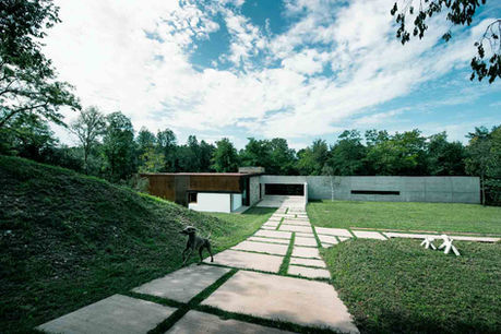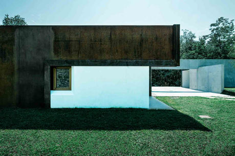 The studio is clad in untreated Siberian larch which will acquire the same shades as the neighbouring woods over time. Another material used for cladding both the house and studio fronts is Corten, chosen because it harmonises with the colours of the earth.